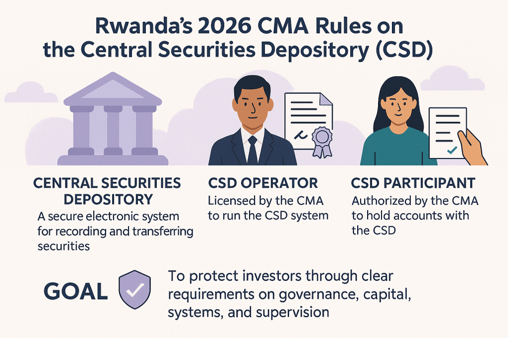 Rwanda’s 2026 CMA Regulations on the Central Securities Depository (CSD) are essentially about trust: ensuring that the “official record” of who owns shares or bonds is protected by strong rules, strong systems, and accountable institutions. Whether an organization wants to run the CSD (as a licensed operator) or access it (as an authorized participant), the Regulations set clear expectations around governance, competence, technology controls, risk management, and minimum capital so that investors’ holdings are safeguarded and the market remains orderly.